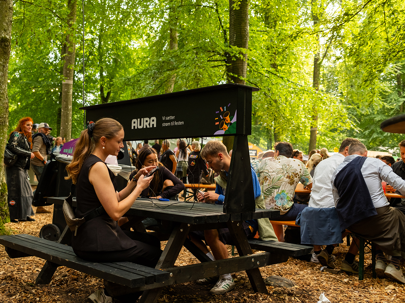 Et fast og populært element i samarbejdet har i mange år været de ikoniske ladeborde, som AURA i tæt samarbejde med Smukfests frivillige har udviklet - både i design og funktionalitet. Her kan gæsterne sætte sig ned og lade op, mens telefonen lader op. Med fornyet energi og strøm på telefonen kan de finde vennerne igen, og festen kan fortsætte.