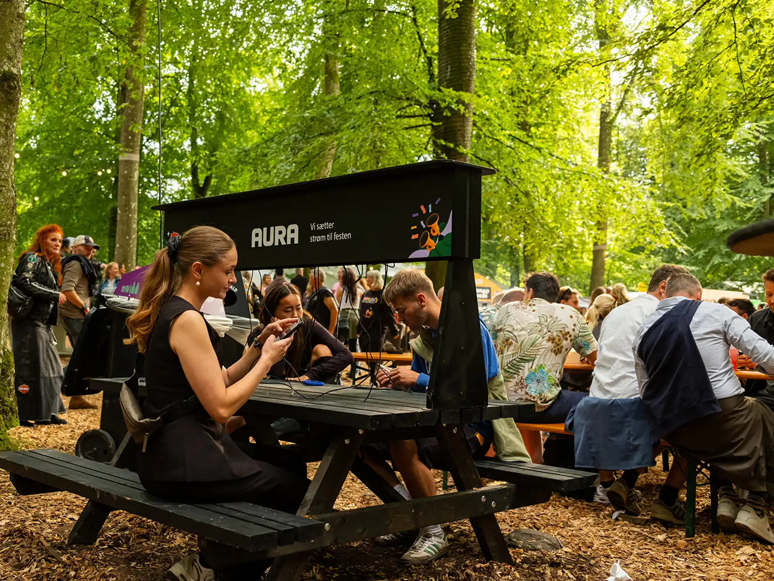 Et fast og populært element i samarbejdet har i mange år været de ikoniske ladeborde, som AURA leverer. Her kan gæsterne sætte sig ned og lade op, mens telefonen lader op. Med fornyet energi og strøm på telefonen kan de finde vennerne igen og festen kan fortsætte.